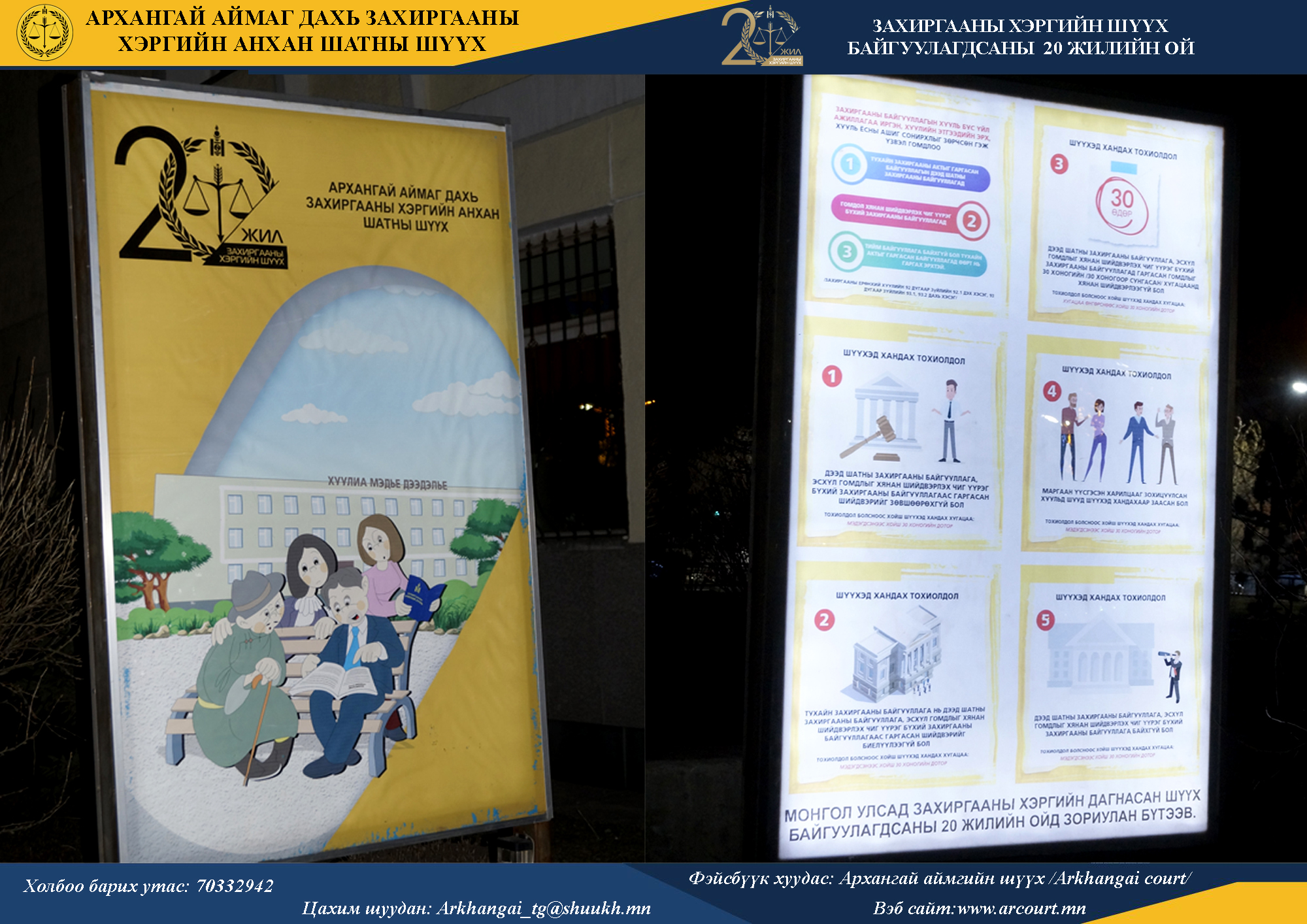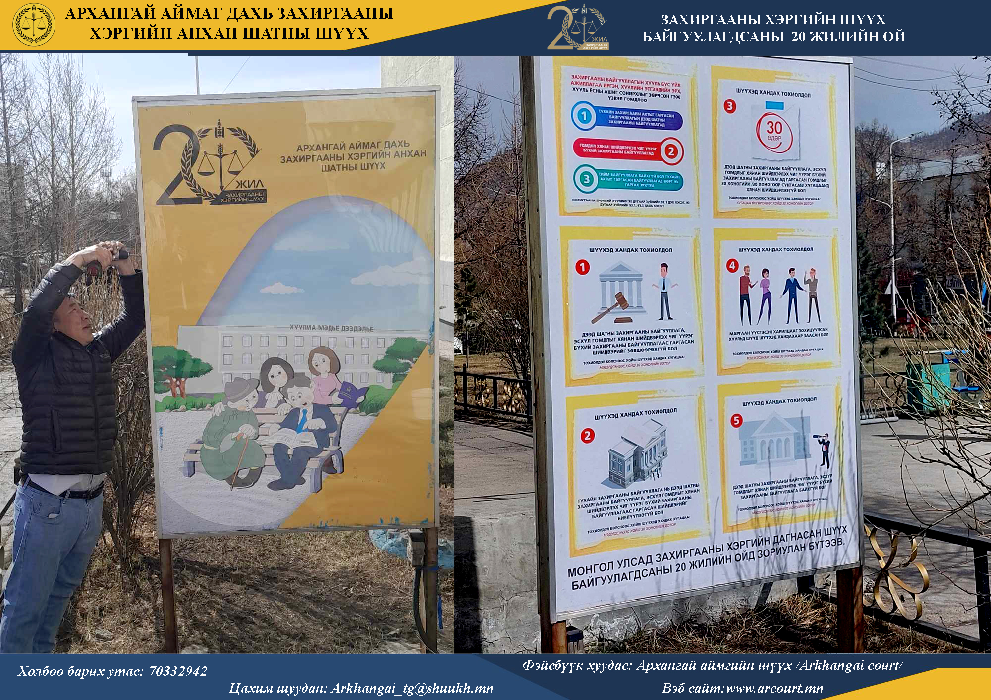 Энэ хүрээнд аймгийн шүүхийн гадна талбайд байрлах иргэдийн эрх зүйн мэдлэгт зориулсан мэдээлэл тавьдаг гэрэлт самбарыг шинэчлэн Захиргааны ерөнхий хууль, Захиргааны хэрэг шүүхэд хянан шийдвэрлэх тухай хуулийн агуулгаар цуврал мэдээллийг бэлтгэж тавьж байхаар төлөвлөөд байна.