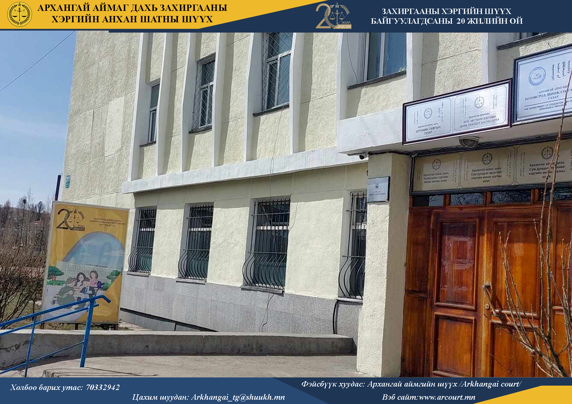 Монгол Улсад захиргааны хэргийн шүүх байгуулагдсаны 20 жилийн ойг тохиолдуулан Архангай аймаг дахь Захиргааны хэргийн анхан шатны шүүхээс иргэдийн эрх зүйн мэдлэгийг нэмэгдүүлэх, шүүхийн ил тод, нээлттэй байдлыг бий болгох, Захиргааны хэргийн шүүхийн онцлогийг танин мэдүүлэхэд чиглэсэн тодорхой ажлуудыг хэрэгжүүлж эхлээд байна.