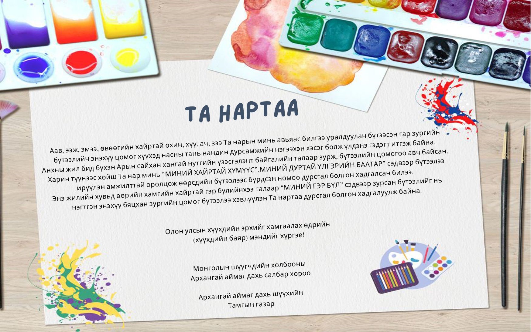 Мөн Монголын шүүгчдийн холбооны Архангай аймаг дахь салбар хорооноос санаачлан шүүгч, ажилтнуудын хүүхэд, ач, зээ нарын дунд “Олон улсын хүүхдийн эрхийг хамгаалах өдөр” хүүхдийн баярыг тохиолдуулан жил бүр зохион байгуулдаг гар зургийн уралдаанаа дөрөв дэх жилдээ зохион байгууллаа.