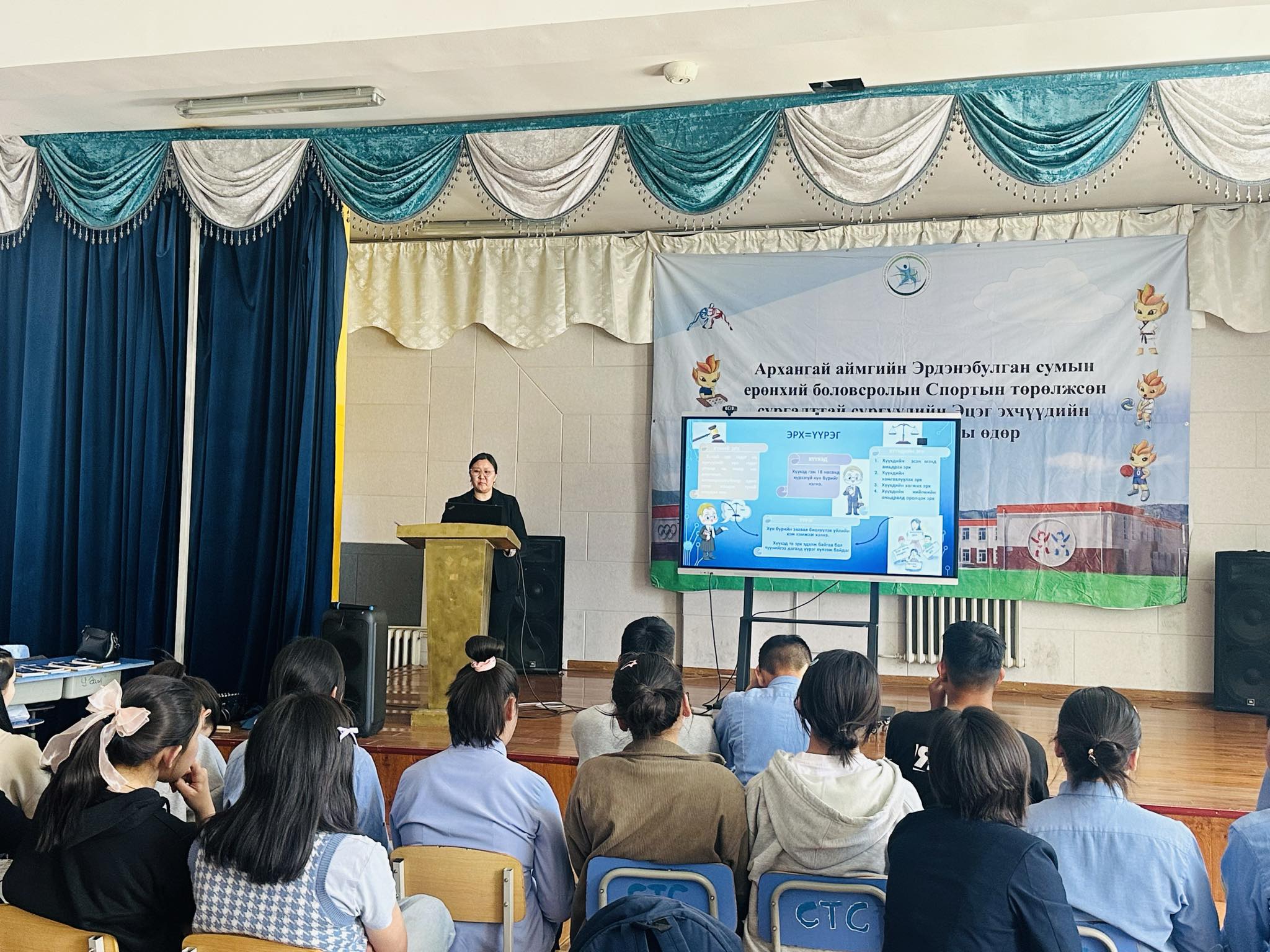 2026-03-13 | 1050Архангай аймгийн Эрдэнэбулган сумын Ерөнхий боловсролын 5 дугаар сургуулийн сурагчдад шүүгчийн туслах Э.Бүрэнтогтох, Б.Дөлгөөн, Г.Цэрэндэжид нар нь "Шүүхийн тухай ойлголт, Гэмт хэрэг, зөрчлөөс урьдчилан сэргийлэх талаар" сургалт зохион байгууллаа.