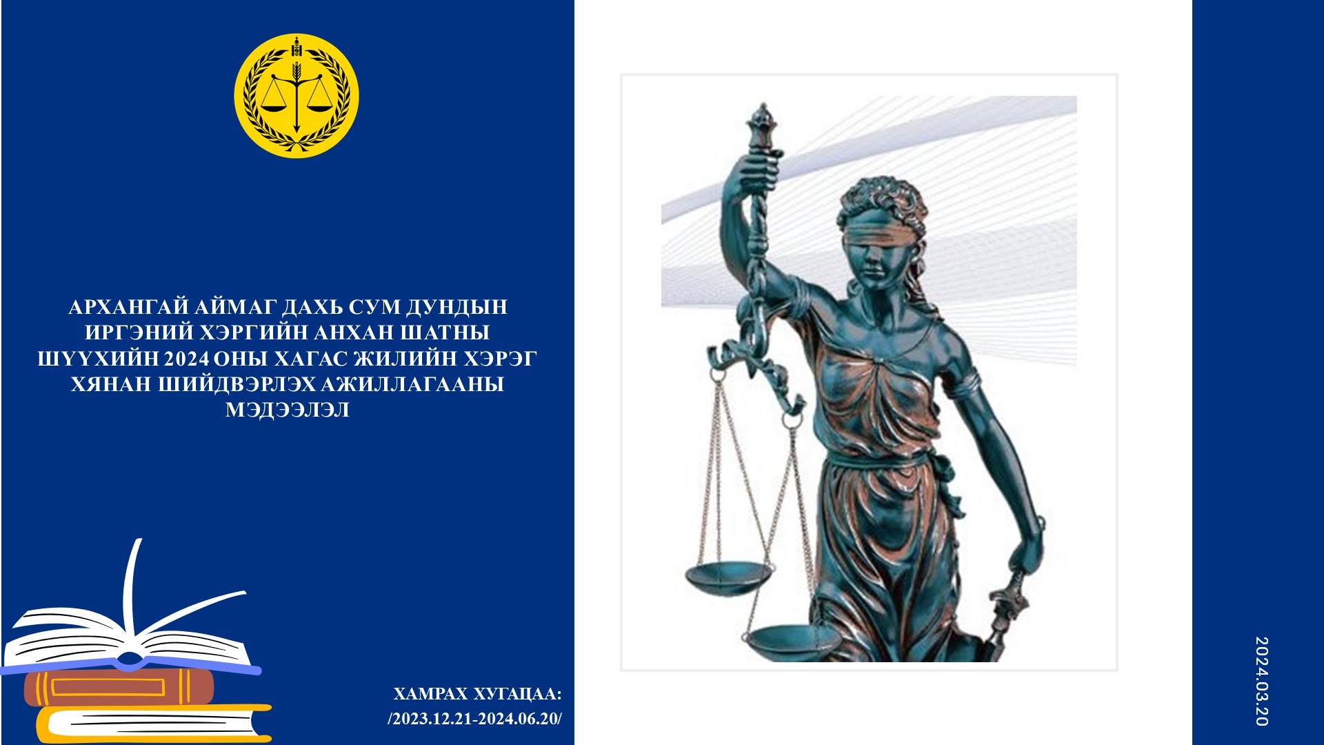 АРХАНГАЙ АЙМАГ ДАХЬ СУМ ДУНДЫН ИРГЭНИЙ ХЭРГИЙН АНХАН ШАТНЫ ШҮҮХИЙН 2024 ОНЫ ХАГАС ЖИЛИЙН ХЭРЭГ ХЯНАН ШИЙДВЭРЛЭХ АЖИЛЛАГААНЫ МЭДЭЭЛЭЛ