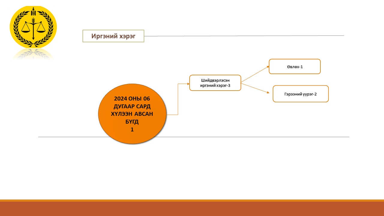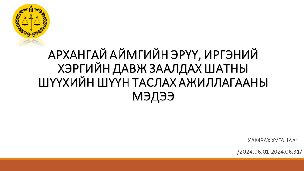 АРХАНГАЙ АЙМГИЙН ЭРҮҮ, ИРГЭНИЙ ХЭРГИЙН ДАВЖ ЗААЛДАХ ШАТНЫ ШҮҮХИЙН 2024 ОНЫ 06 ДУГААР САРЫН ШҮҮН ТАСЛАХ АЖЛЫН МЭДЭЭ