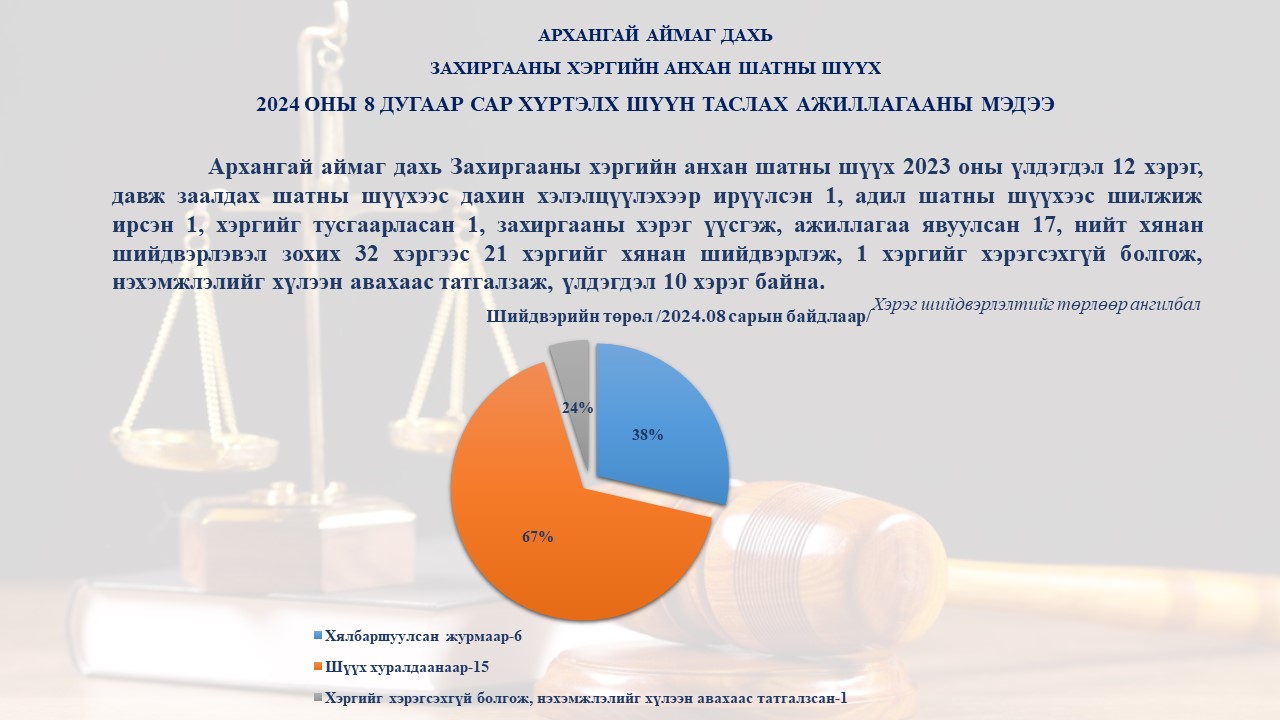 Архангай аймаг дахь Захиргааны хэргийн анхан шатны шүүхийн 2024 оны 8 дугаар сарын шүүн таслах ажиллгааны мэдээ