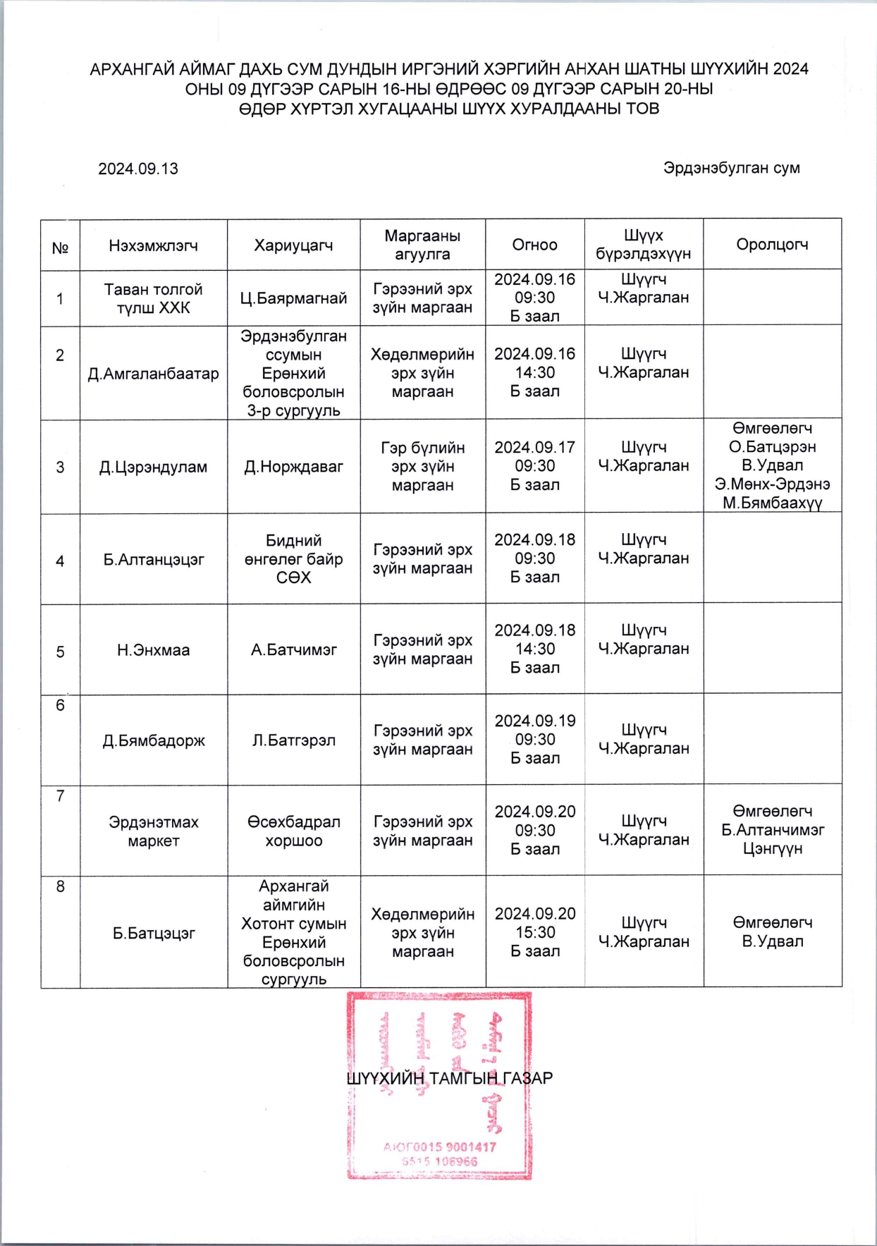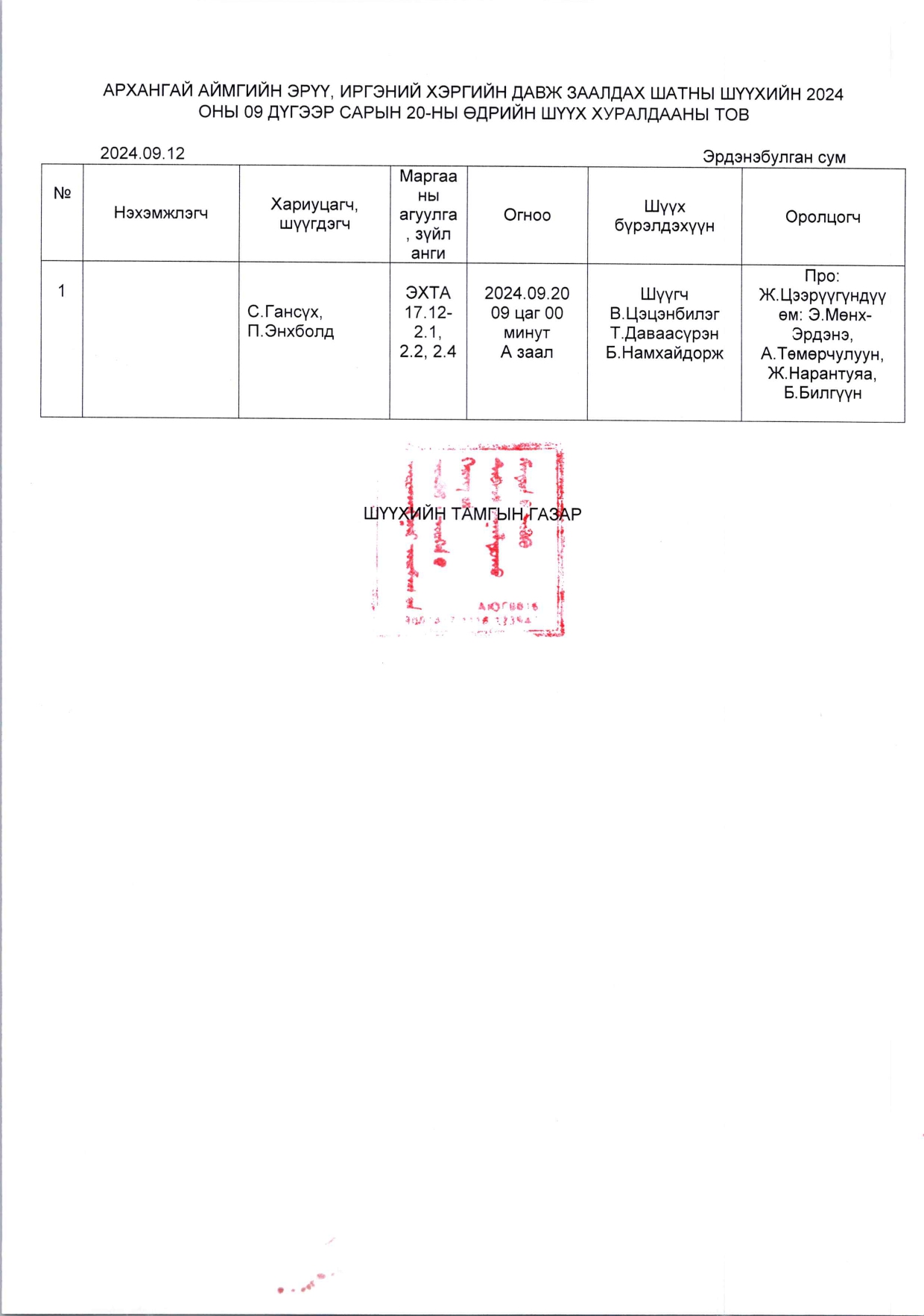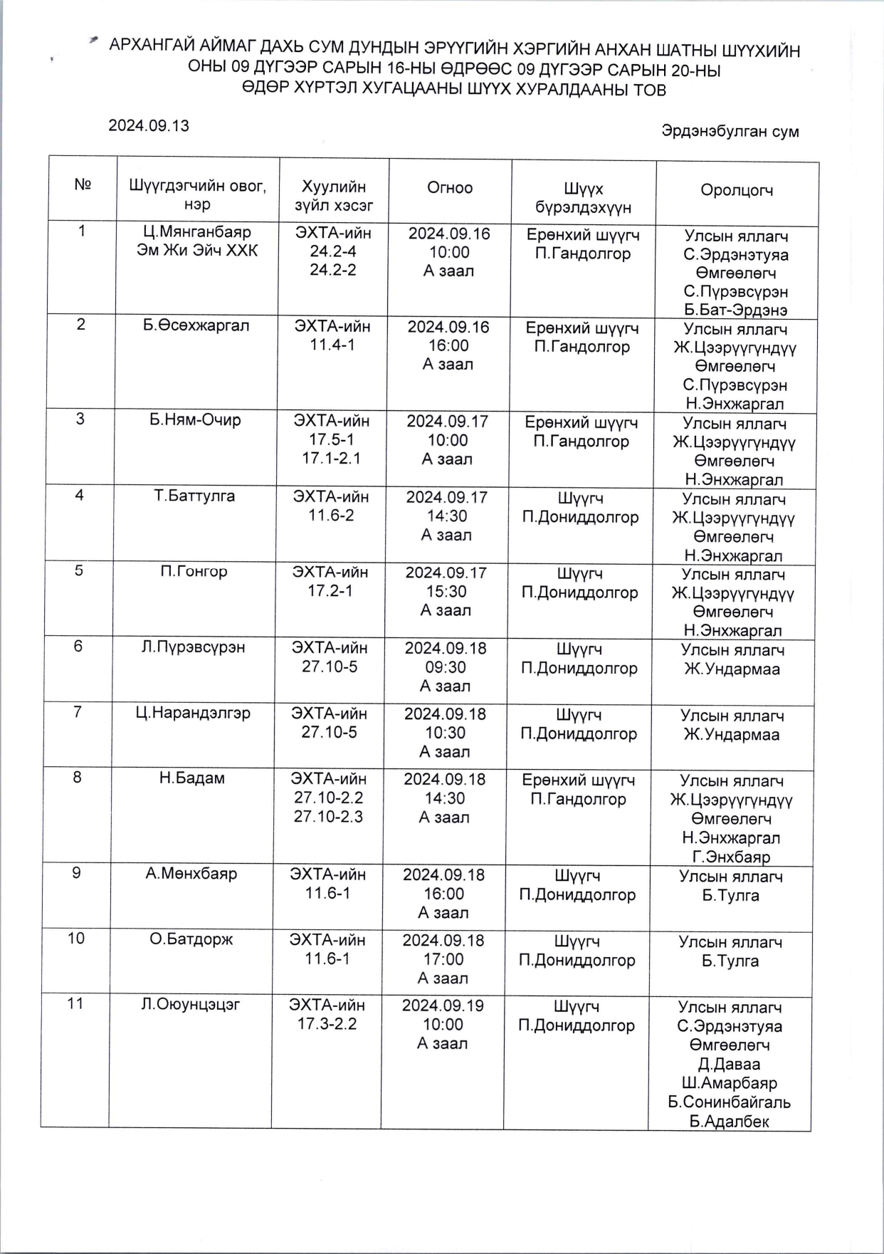 2024.09.16-2024.09.20 хүртэлх шүүх хуралдааны тов