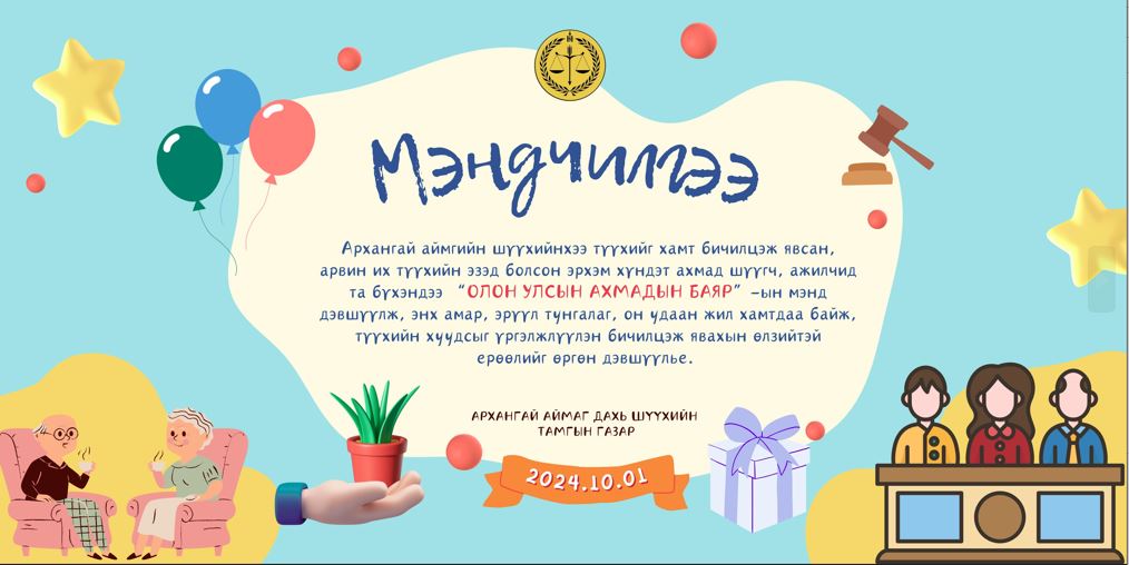 2025-12-10 | 486Архангай аймгийн шүүхийнхээ түүхийг хамт бичилцэж явсан, арвин их түүхийн эзэд болсон эрхэм хүндэт ахмад шүүгч, ажилчид та бүхэндээ “ОЛОН УЛСЫН АХМАДЫН БАЯР”-ын мэнд дэвшүүлж, энх амар, эрүүл тунгалаг, он удаан жил хамтдаа байж, түүхийн хуудсыг үргэлжлүүлэн бичилцэж явахын өлзийтэй ерөөлийг өргөн дэвшүүлье.