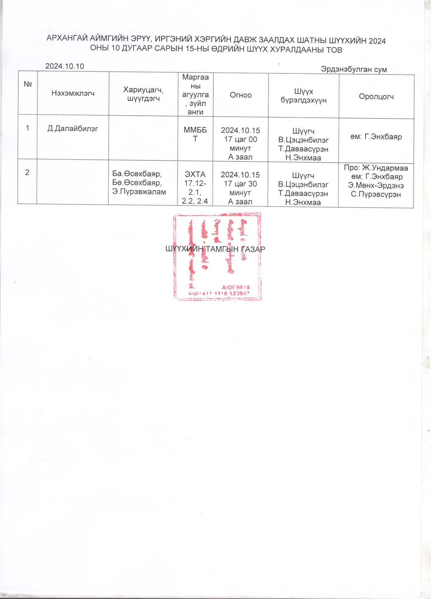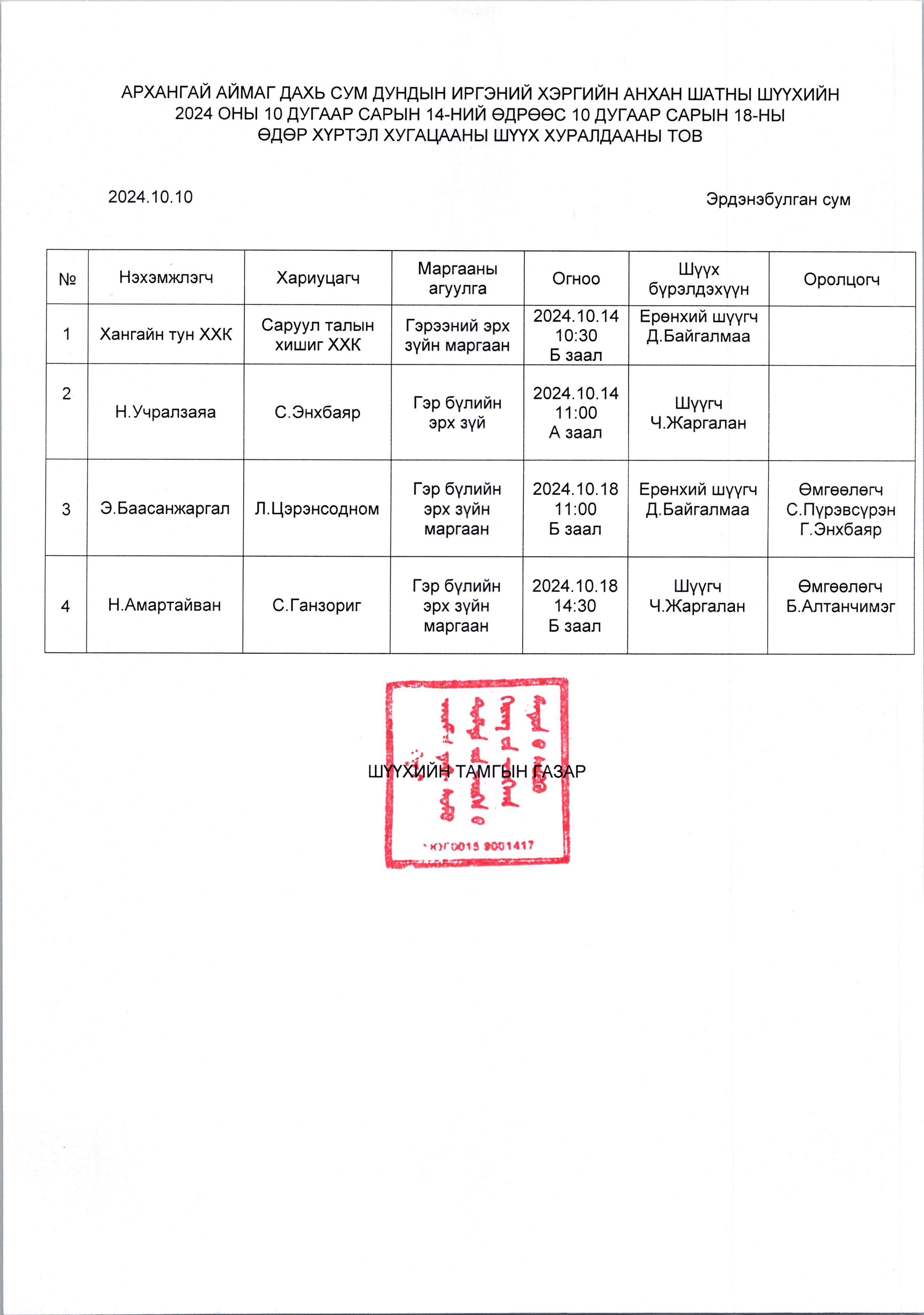 2024.10.14-2024.10.18 хүртэлх шүүх хуралдааны тов