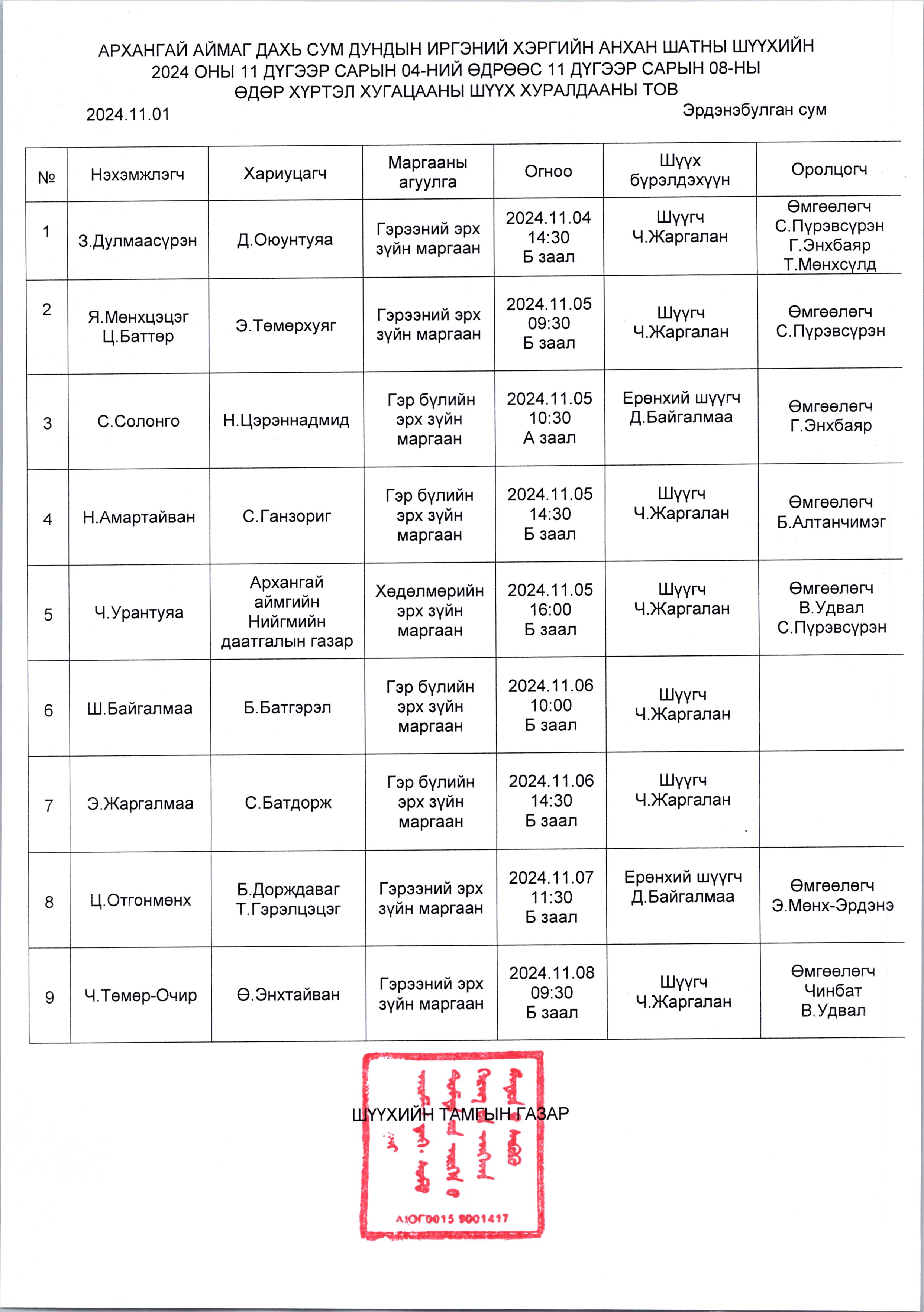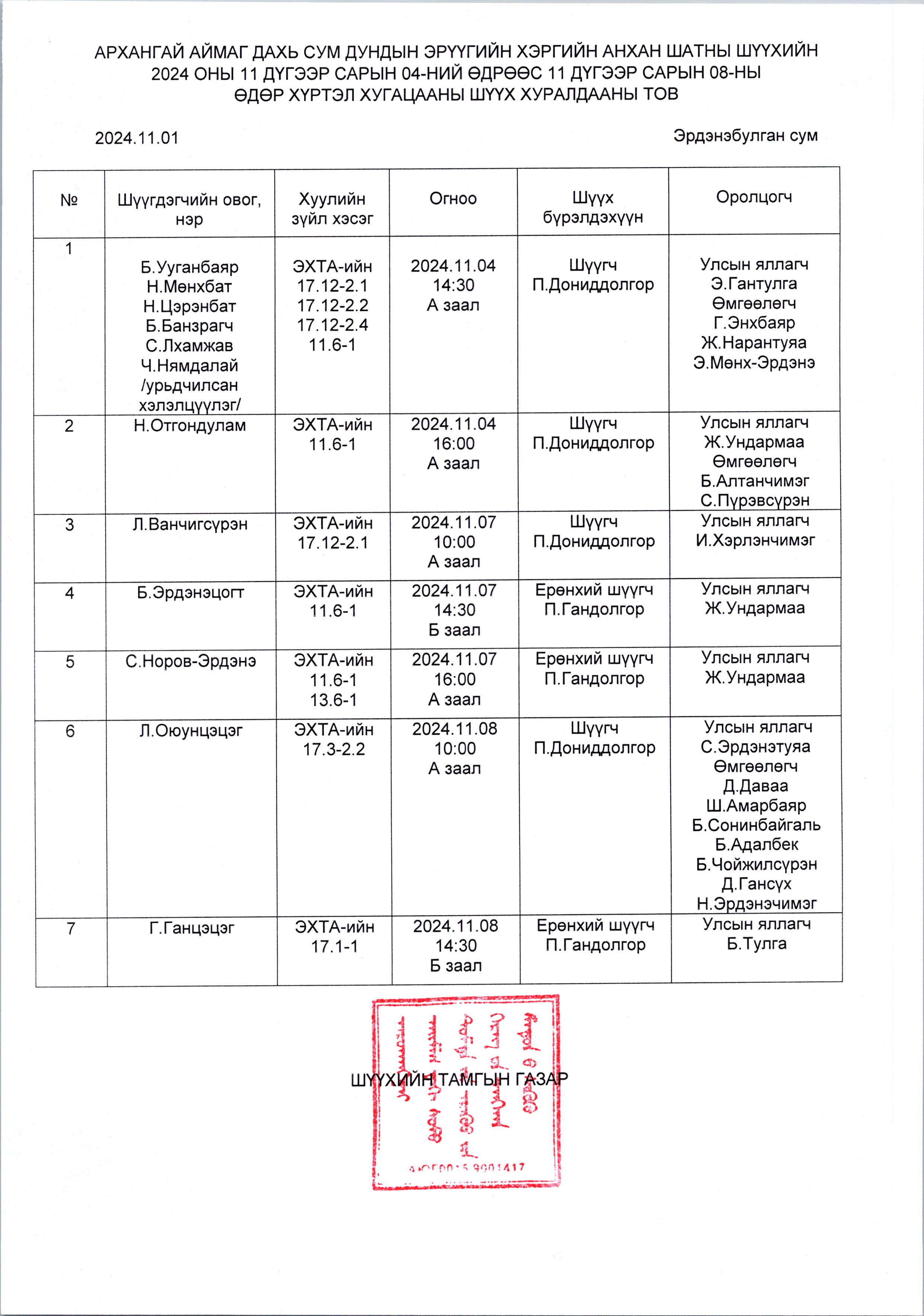 2024.11.04-2024.11.08 хүртэлх шүүх хуралдааны тов