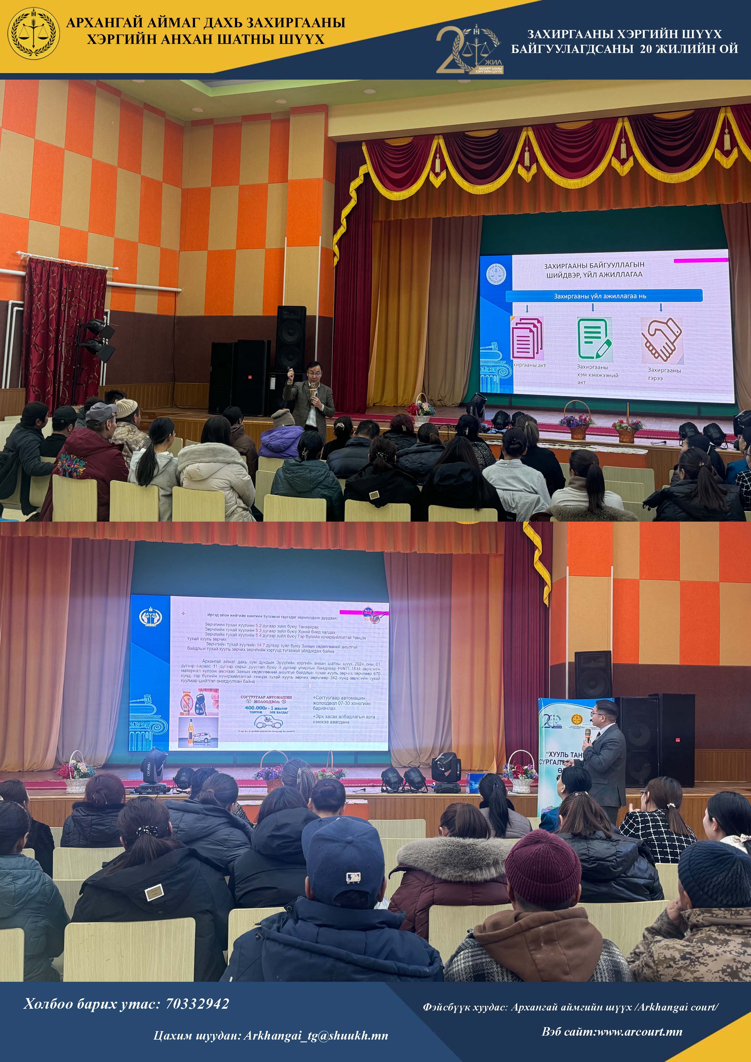 Монгол Улсад захиргааны хэргийн шүүх байгуулагдсаны 20 жилийн ойг тохиолдуулан Архангай аймаг дахь Захиргааны хэргийн анхан шатны шүүхээс санаачлан иргэдийн эрх зүйн мэдлэгийг нэмэгдүүлэх, шүүхийн ил тод, нээлттэй байдлыг хангахад чиглэсэн олон ажлыг 2024 онд санаачлан хэрэгжүүлж байгаа билээ.