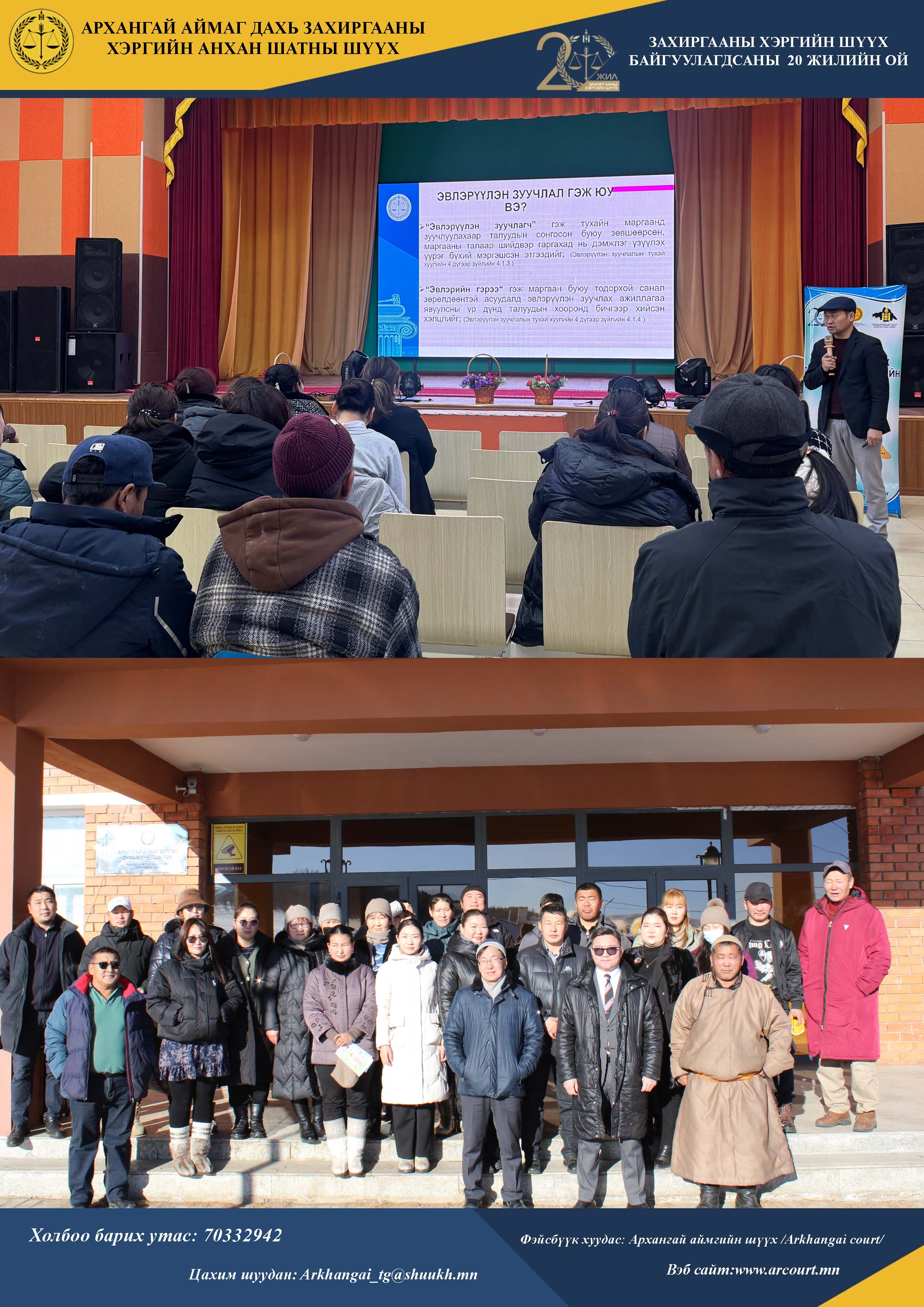 Энэхүү ажлын хүрээнд аймгийн нийт шүүх, Шүүхийн Тамгын газар, Архангай аймгийн гэмт хэргээс урьдчилан сэргийлэх ажлыг зохицуулах салбар зөвлөлтэй хамтран аймгийнхаа 19 суманд “Хууль таниулах, сургалт, мэдээллийн өдөрлөг” арга хэмжээг 2024 оны 4 дүгээр сараас эхлэн зохион байгуулж байгаа билээ.
