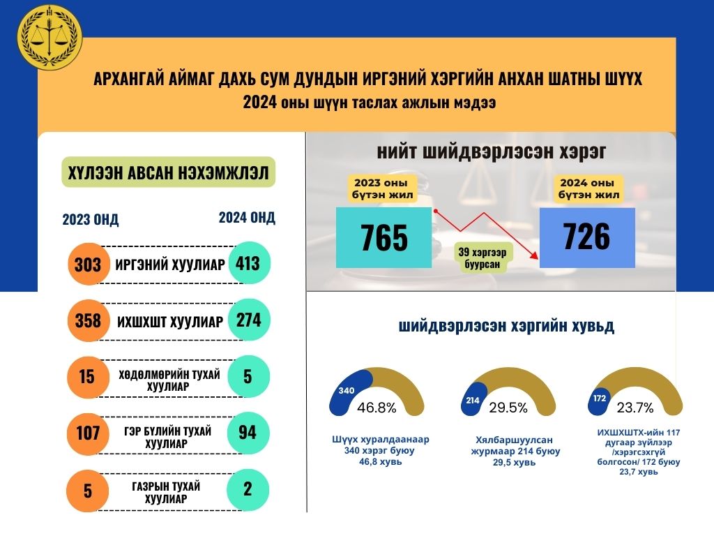 Архангай аймаг дахь сум дундын Иргэний хэргийн анхан шатны шүүхийн 2024 оны шүүн таслах ажлын мэдээ