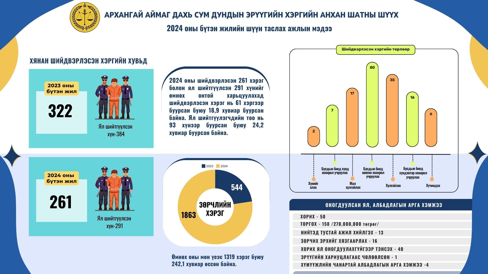 Архангай аймаг дахь сум дундын Эрүүгийн хэргийн анхан шатны шүүхийн 2024 оны шүүн таслах ажлын мэдээ