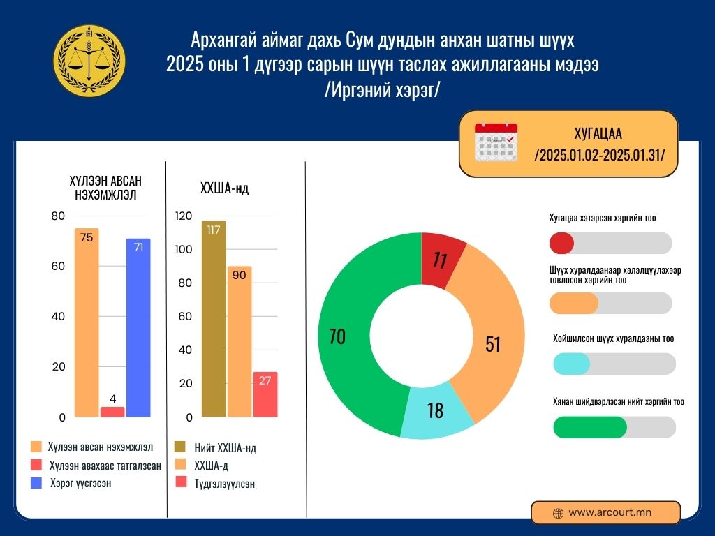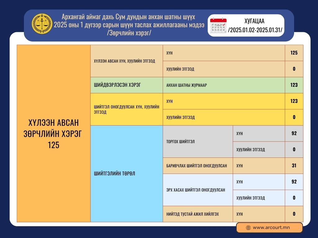 Архангай аймаг дахь Сум дундын анхан шатны шүүхийн 2025 оны 1 дүгээр сарын шүүн таслах ажиллагааны мэдээ