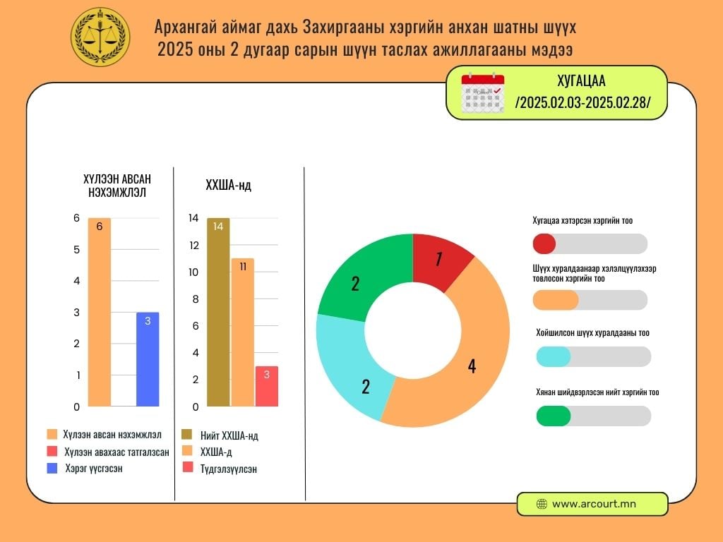 Архангай аймаг дахь Сум дундын анхан шатны шүүхийн 2025 оны 2 дугаар сарын шүүн таслах ажиллагааны мэдээ