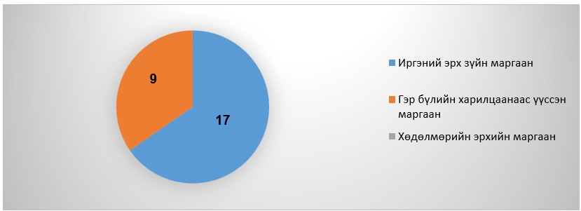 Нийт шийдвэрлэсэн 26 өргөдөл, нэхэмжлэлийн 17 буюу 65.4 хувь нь иргэний эрх зүйн маргаан, 9 буюу 34.6 хувь нь гэр бүлийн харилцаанаас үүссэн маргаан эзэлж байна.