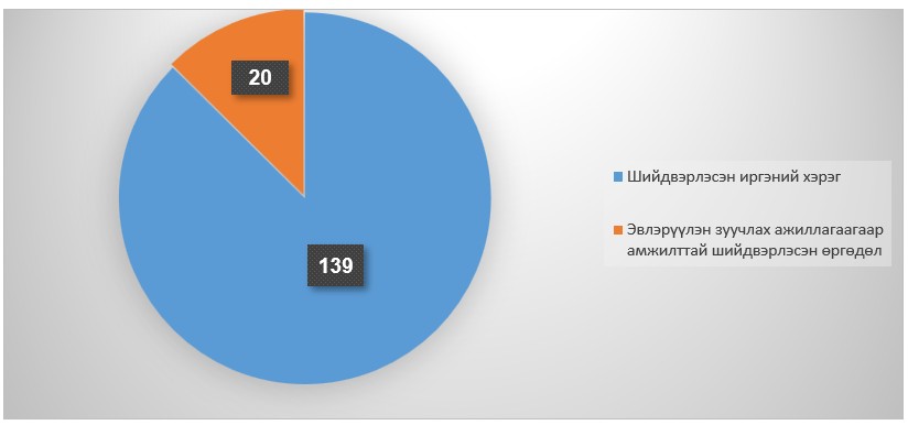 Үүнээс: Өргөдөл гаргагчийн нэхэмжилсэн нэхэмжлэлийн шаардлагыг уригдагч тал сайн дураар бүрэн биелүүлсэн шалтгаанаар 18 өргөдлийг буцаасан байна.