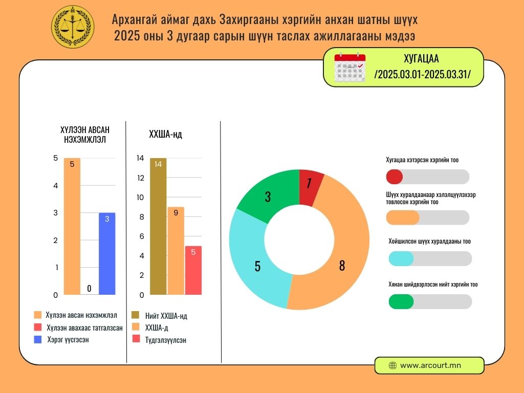 Архангай аймаг дахь Захиргааны хэргийн анхан шатны шүүхийн 2025 оны 1 дүгээр улирлын шүүн таслах ажиллагааны мэдээ