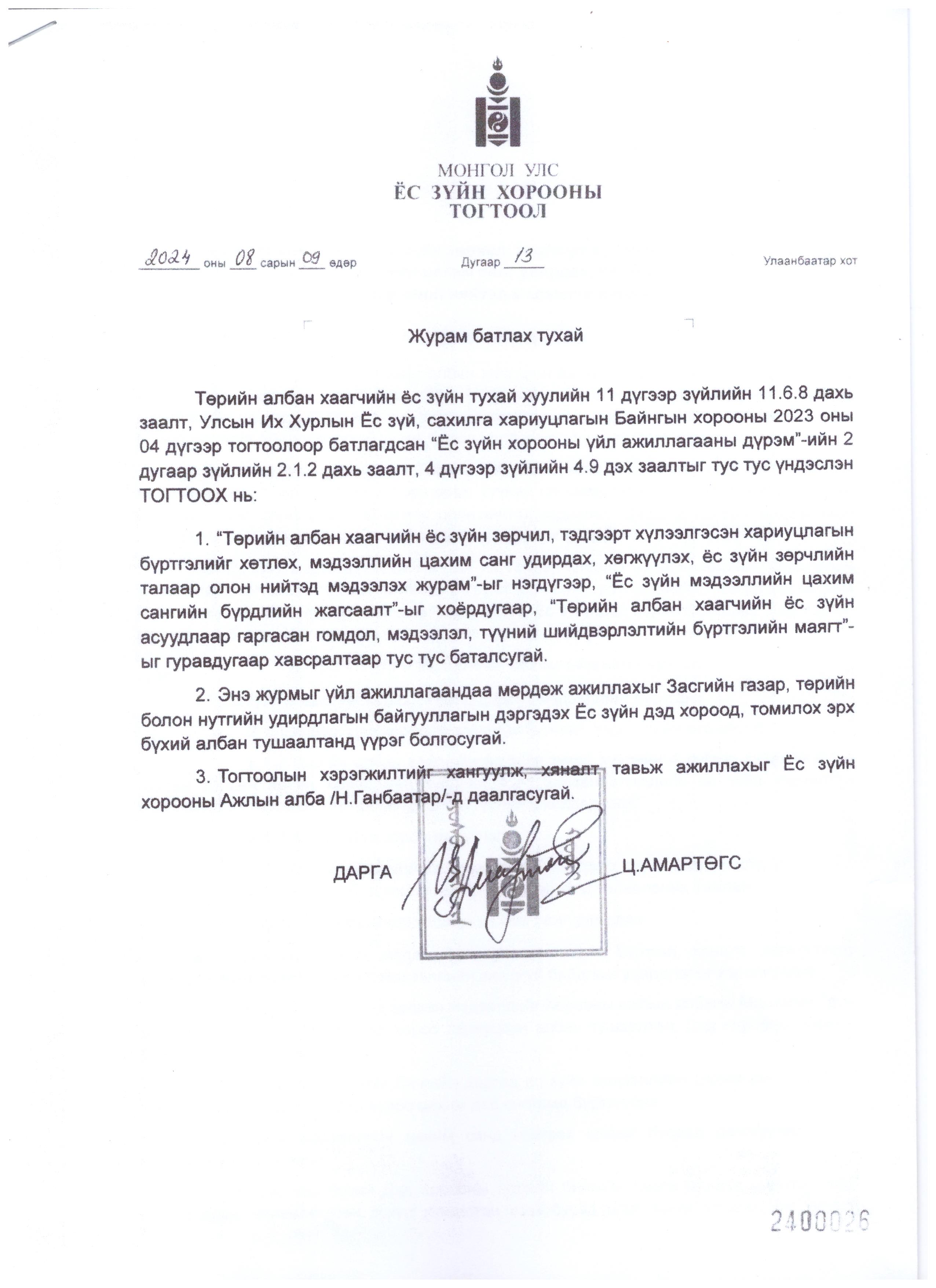 Уг сургалтаар Монгол Улсын Ёс хорооны 2024 оны 08 дугаар сарын 09-ний өдрийн 13 дугаар тогтоолыг танилцуулснаараа онцлог сургалт болов.