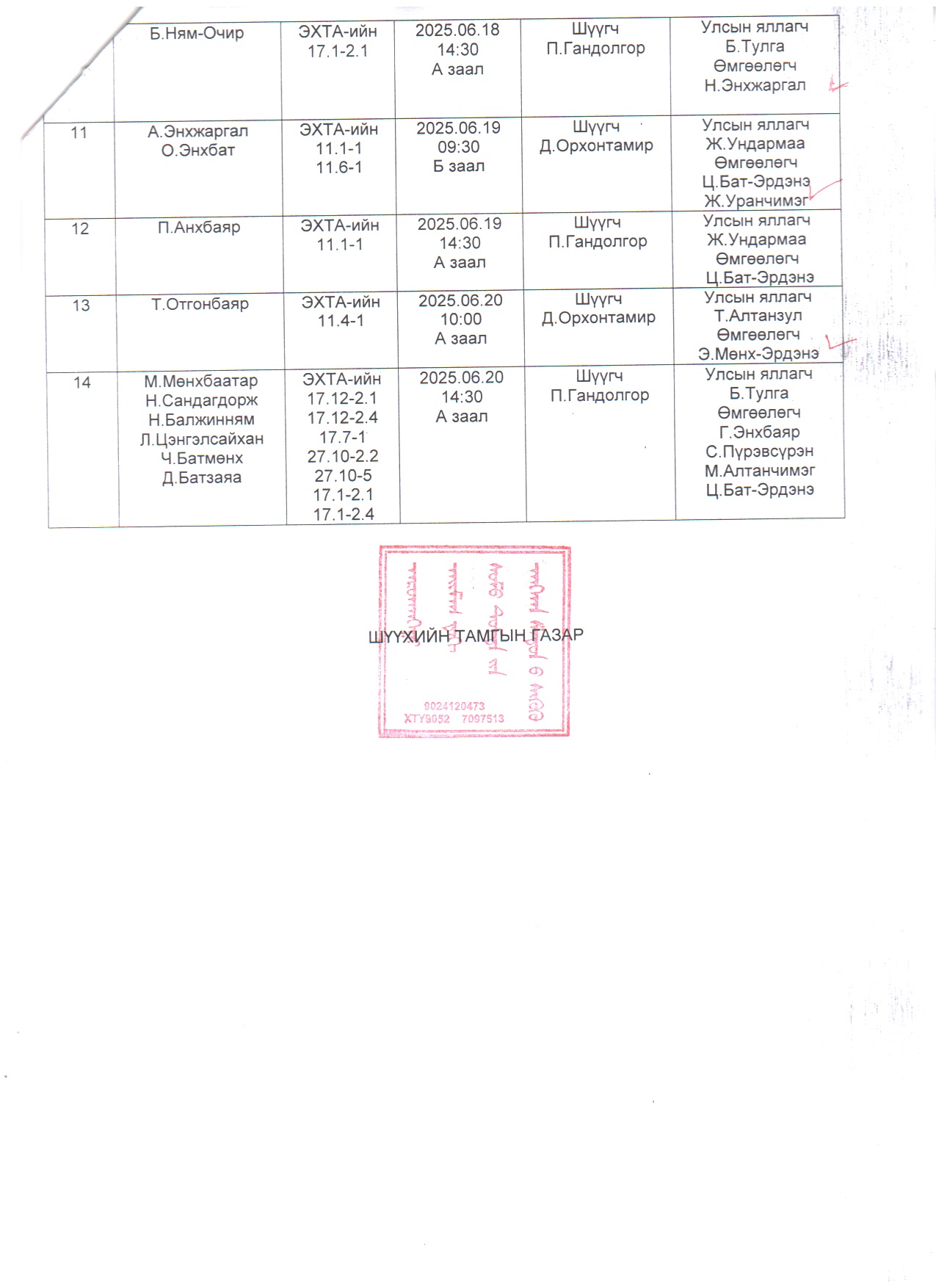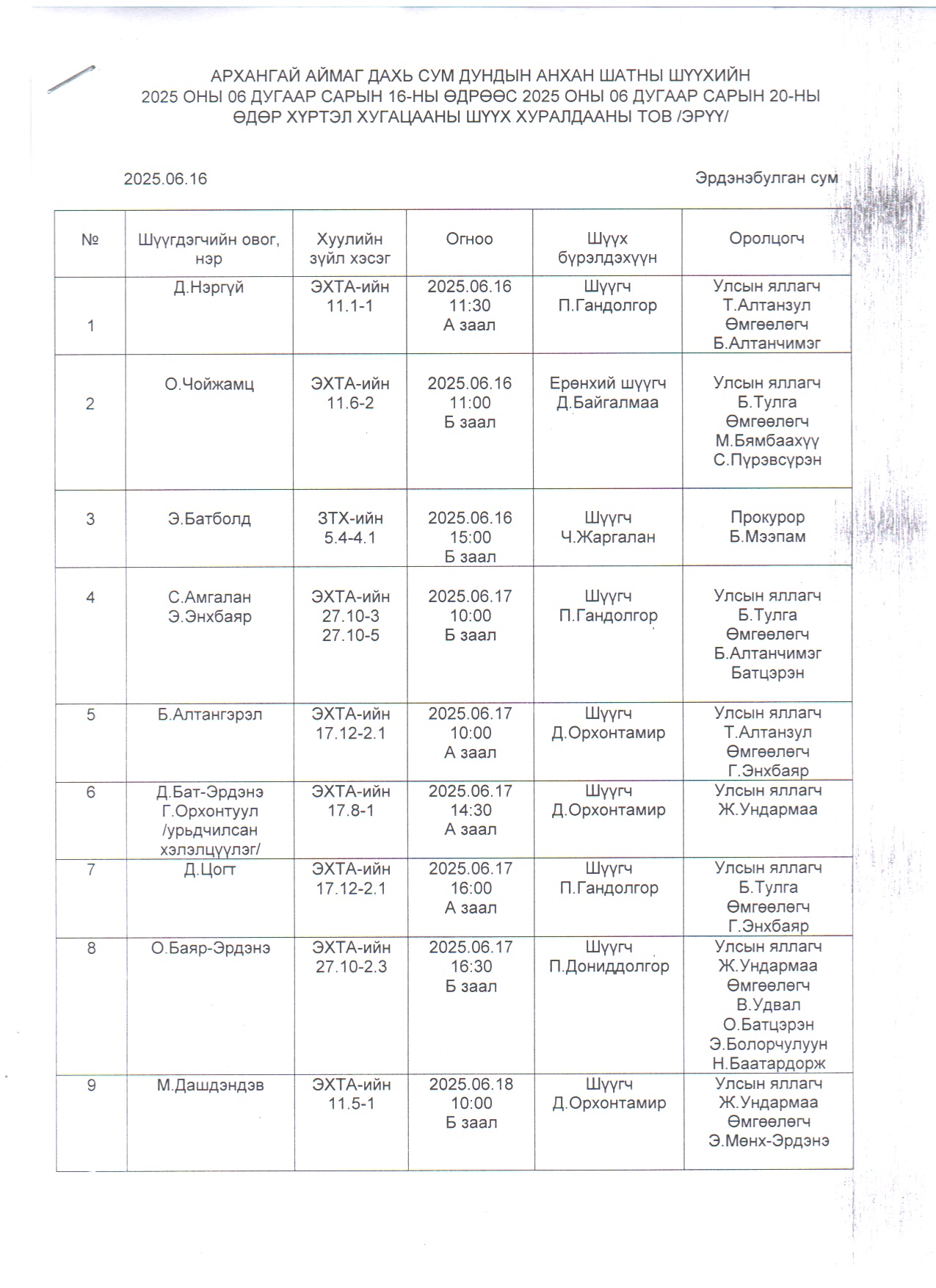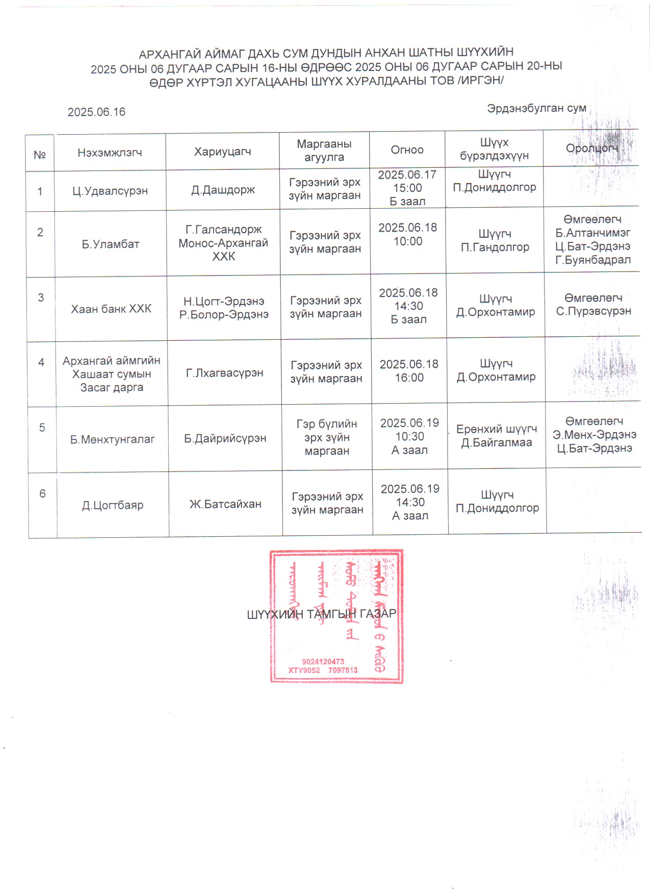 2025.06.16-2025.06.20 хүртэлх шүүх хуралдааны тов