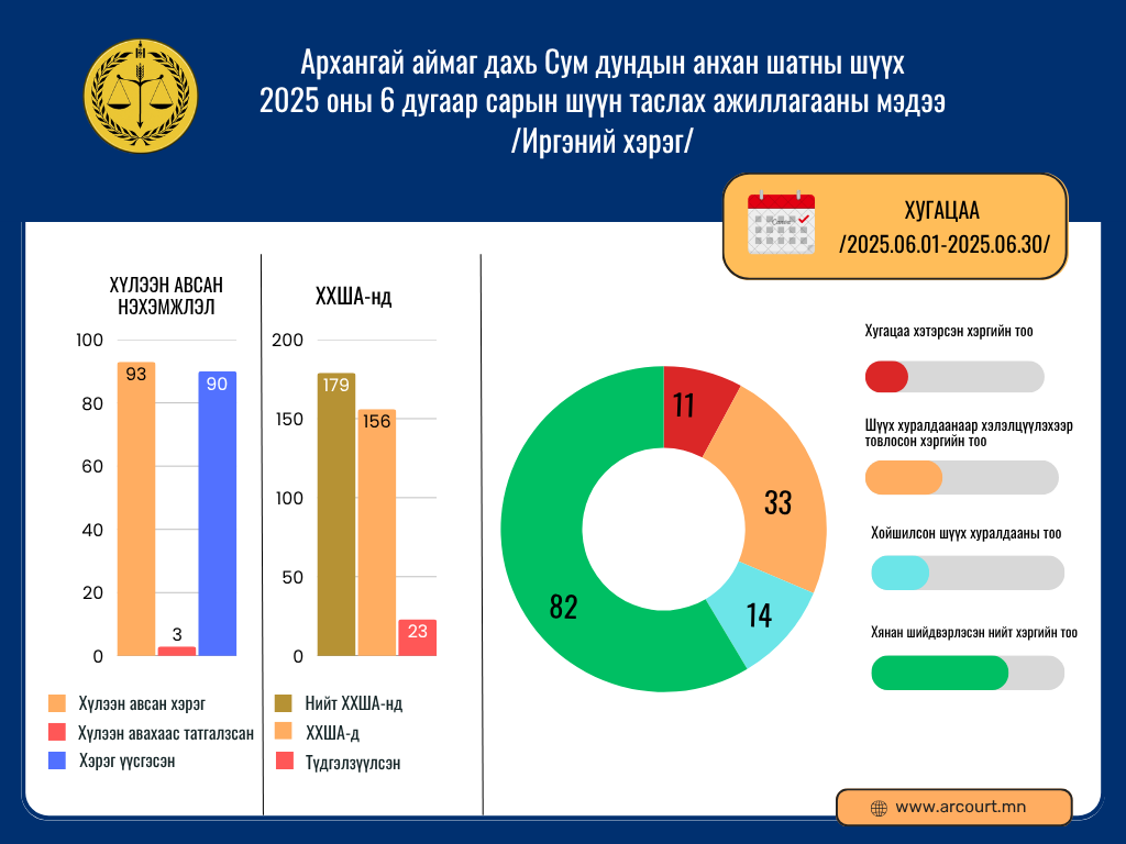 Архангай аймаг дахь Сум дундын анхан шатны шүүхийн 2025 оны 6 дугаар сарын шүүн таслах ажиллагааны мэдээ