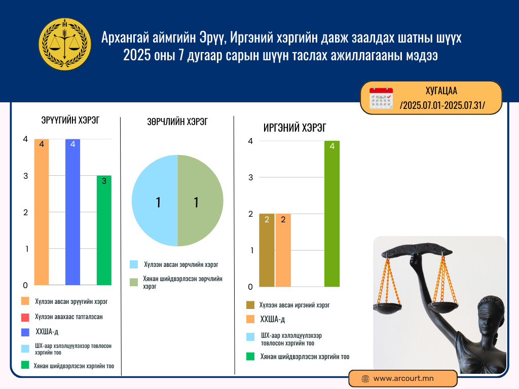Архангай аймгийн Эрүү, Иргэний хэргийн давж заалдах шатны шүүхийн 2025 оны 7 дугаар сарын шүүн таслах ажиллагааны мэдээ