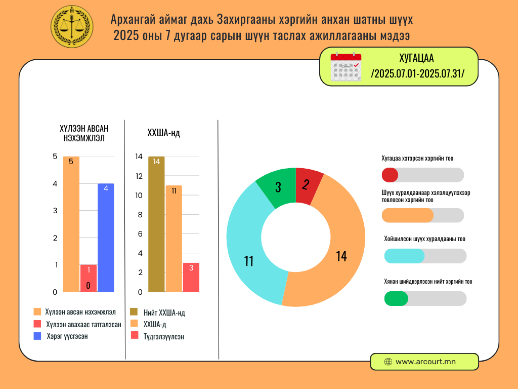 Архангай аймаг дахь Захиргааны хэргийн анхан шатны шүүхийн 2025 оны 7 дугаар сарын шүүн таслах ажиллагааны мэдээ