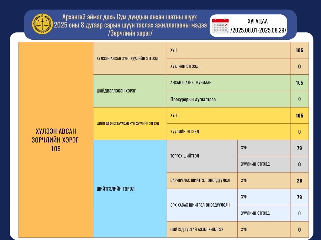Архангай аймаг дахь Сум дундын анхан шатны шүүхийн 2025 оны 8 дугаар сарын шүүн таслах ажиллагааны мэдээ