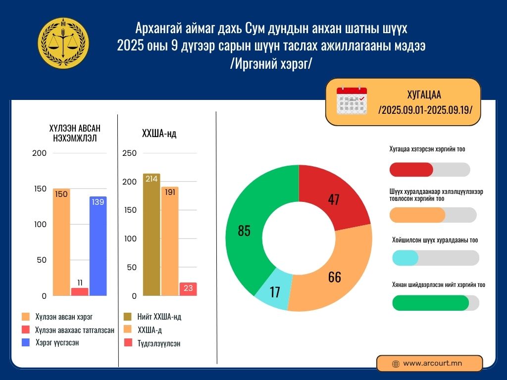 Архангай аймаг дахь Сум дундын анхан шатны шүүхийн 2025 оны 9 дүгээр сарын шүүн таслах ажиллагааны мэдээ