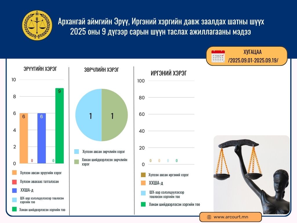 Архангай аймаг дахь Сум дундын анхан шатны шүүхийн 2025 оны 9 дүгээр сарын шүүн таслах ажиллагааны мэдээ