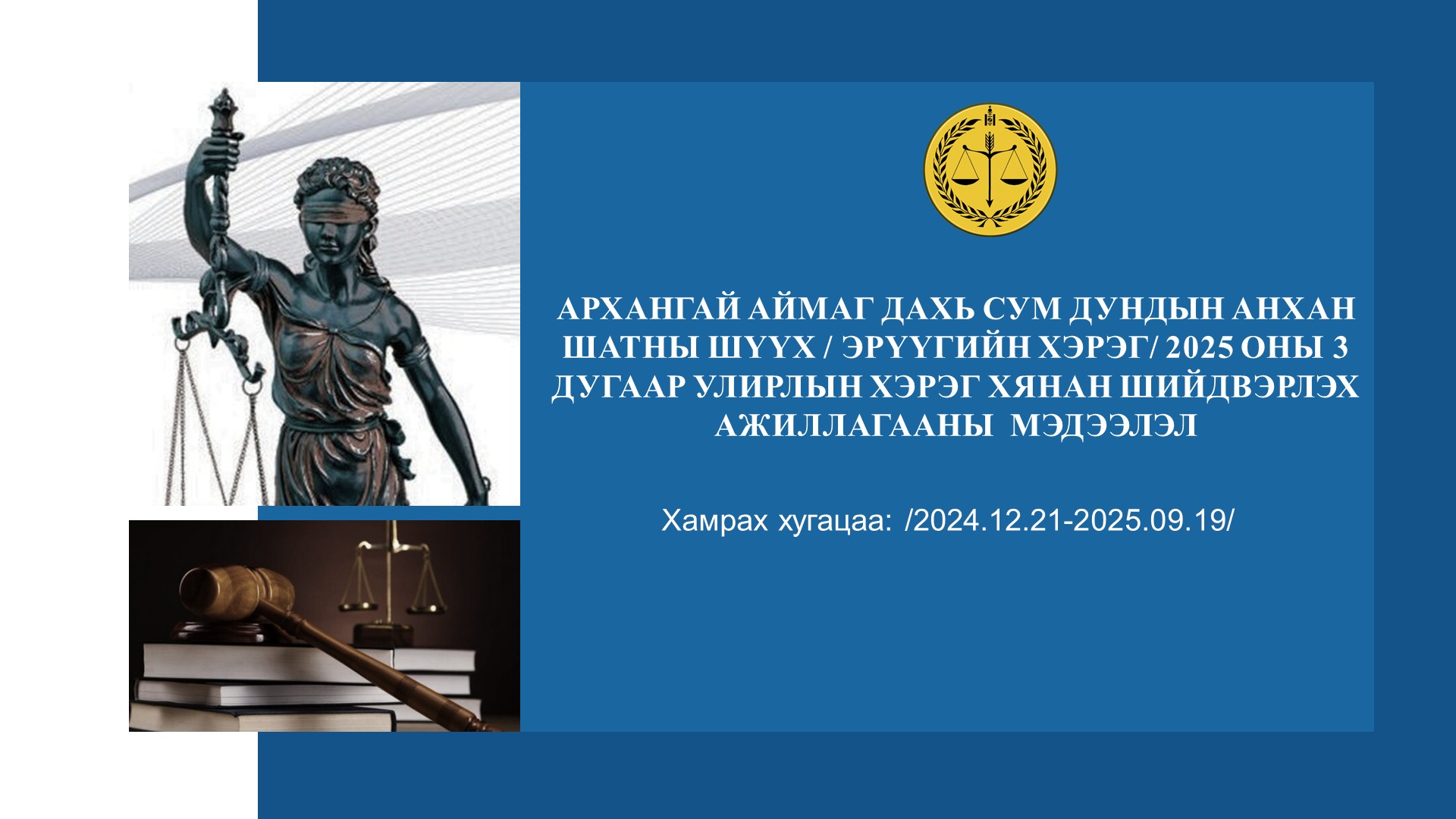 Архангай аймаг дахь Сум дундын анхан шатны шүүхийн 2025 оны 3 дугаар улирлын шүүн таслах ажиллагааны мэдээ