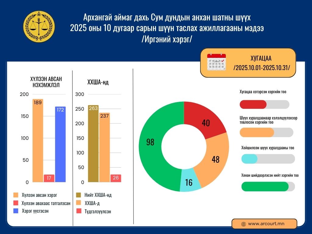 Архангай аймаг дахь Сум дундын анхан шатны шүүхийн 2025 оны 10 дугаар сарын шүүн таслах ажиллагааны мэдээ