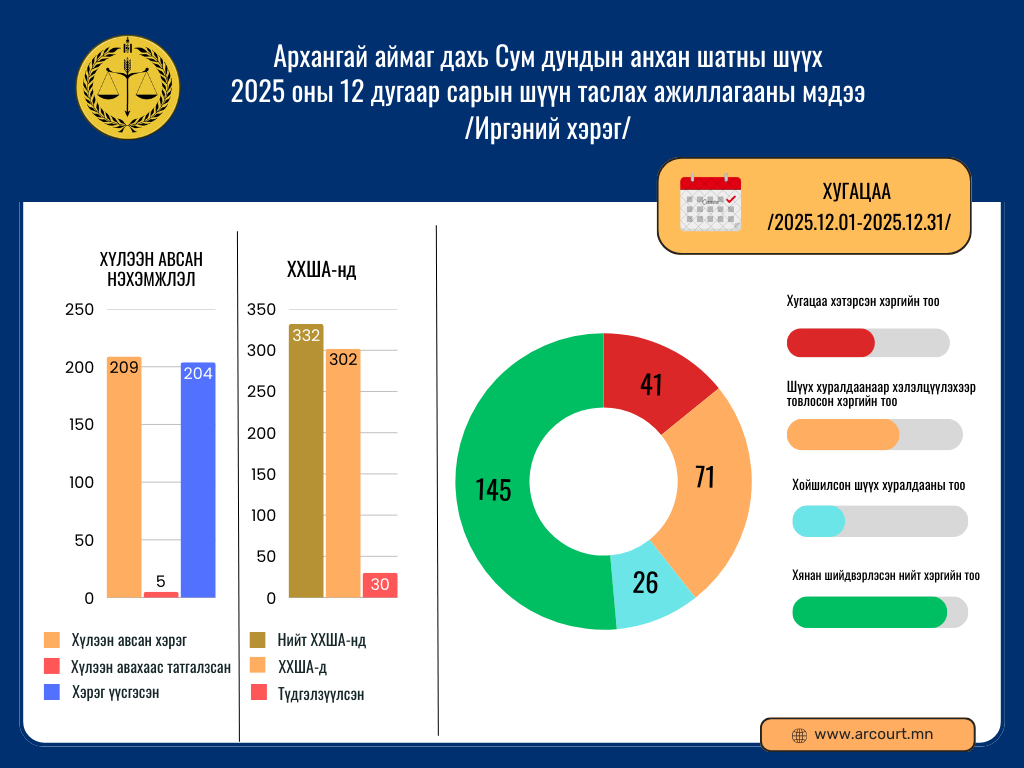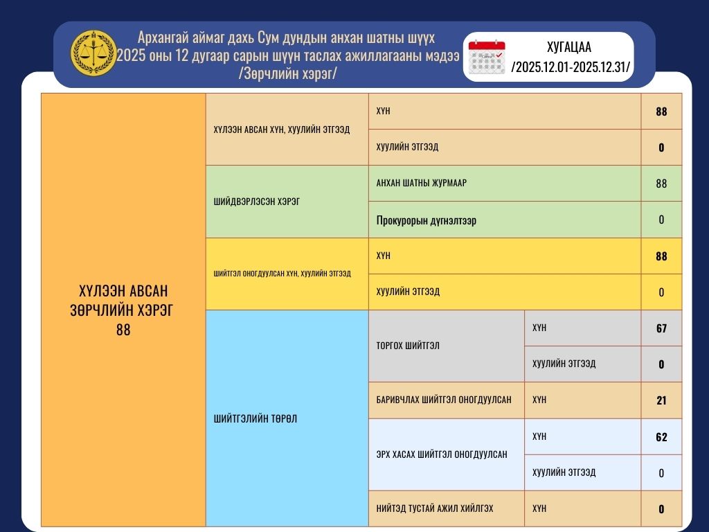 Архангай аймаг дахь Сум дундын анхан шатны шүүхийн 2025 оны 12 дугаар сарын шүүн таслах ажиллагааны мэдээ