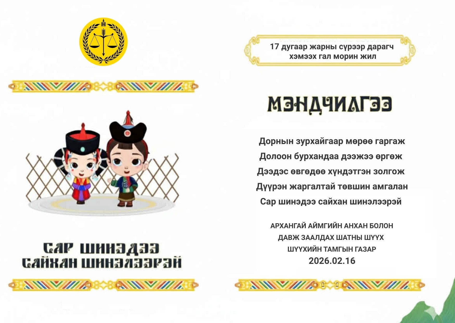 Архангай аймаг дахь Захиргааны хэргийн анхан шатны шүүхийн 2026 оны 2 дугаар сарын шүүн таслах ажиллагааны мэдээ