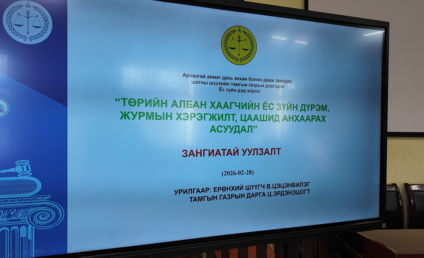 2026-03-12 | 197Архангай аймаг дахь анхан болон давж заалдах шүүхийн Тамгын газрын дэргэдэх ёс зүйн дэд хорооноос 2026 оны үйл ажиллагааны төлөвлөгөөнд тусгагдсаны дагуу “Төрийн албан хаагчийн ёс зүйн дүрэм, журмын хэрэгжилт, цаашид анхаарах асуудал” сэдвээр уулзалт зохион байгууллаа.