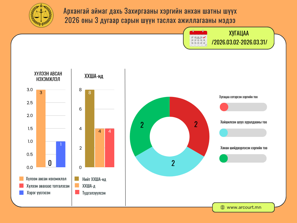 Архангай аймаг дахь Сум дундын анхан шатны шүүхийн 2026 оны 3 дугаар сарын шүүн таслах ажиллагааны мэдээ