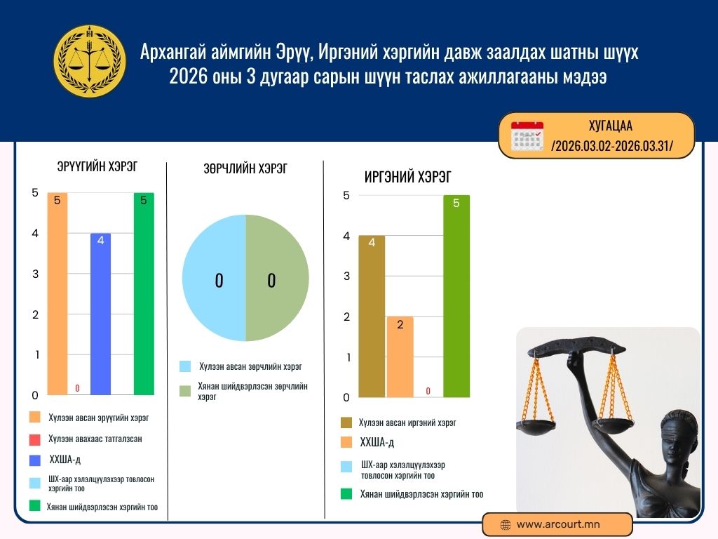 Архангай аймаг дахь Сум дундын анхан шатны шүүхийн 2026 оны 3 дугаар сарын шүүн таслах ажиллагааны мэдээ